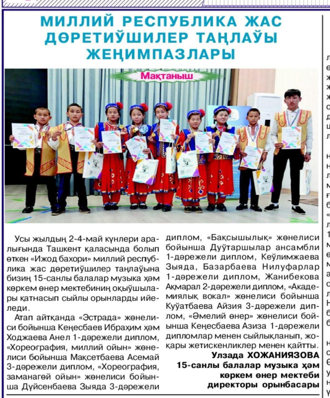 2025-jıl 19-mart kúni Aqmanǵit tańi gazetasinda Nókis rayonı 15-sanli balalar muzika hám kórkem óner mektebi jámááti ustaz oqitiwshi Rawaj Primovtiń 60 jas yubiley jasi menen qutliqlaw Sonday-aq direktor orinbasari U.Xojaniyazovaniń Milliy Respublika jas dóretiwshiler tańlawı jeńimpazları atamasinda maqalasi jaritildi.