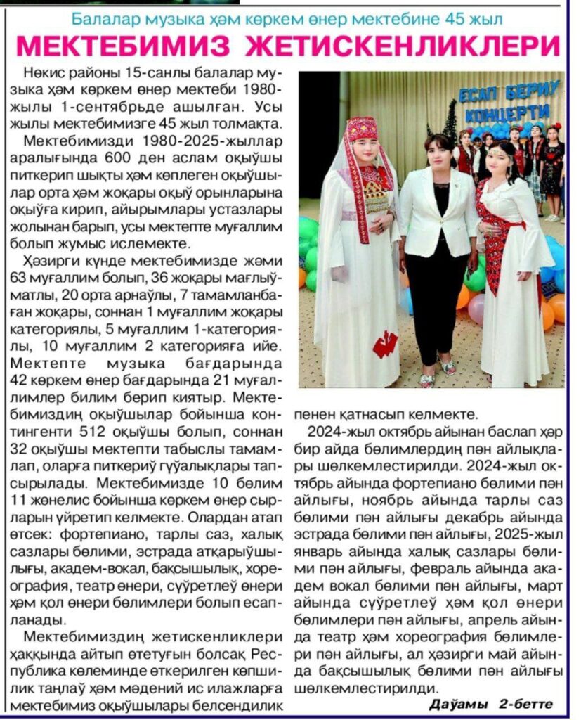 2025-jıl may ayı Aqmanǵit tańi gazetasiniń 10-saninda Nókis rayonı 15-sanli balalar muzika hám kórkem óner mektebine 45 jıl tolıw múnásebeti menen mektebimiz direktorı, Xalıq deputatlari rayonlıq Keńesi deputati V.Utegenovaniń «Mektebimiz jetiskenlikleri» atamasinda maqalasi jaritildi.